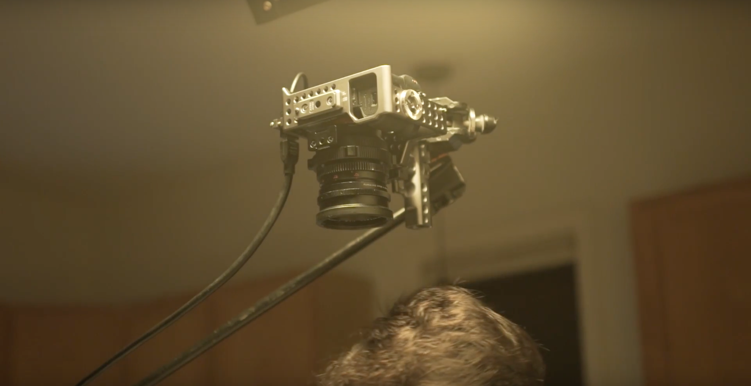 For composition, FAILSAFE’s director, Jon Levert, and I landed on the idea of surveillance feeling shots to help push the sense of eyes being on the reporter as he works. This top-down shot really emphasizes the importance of the story he is putting together while maintaining the feeling of eyes from a higher power. I also allowed the camera to fall off the table at the top of the frame just to create a little bit of depth to really drive home the idea that there is deep importance to the papers on the table. This angle was achieved simply with a C-stand armed out with mafer clamp attached to the top handle of the camera (picture below). It does not get more indie than that!