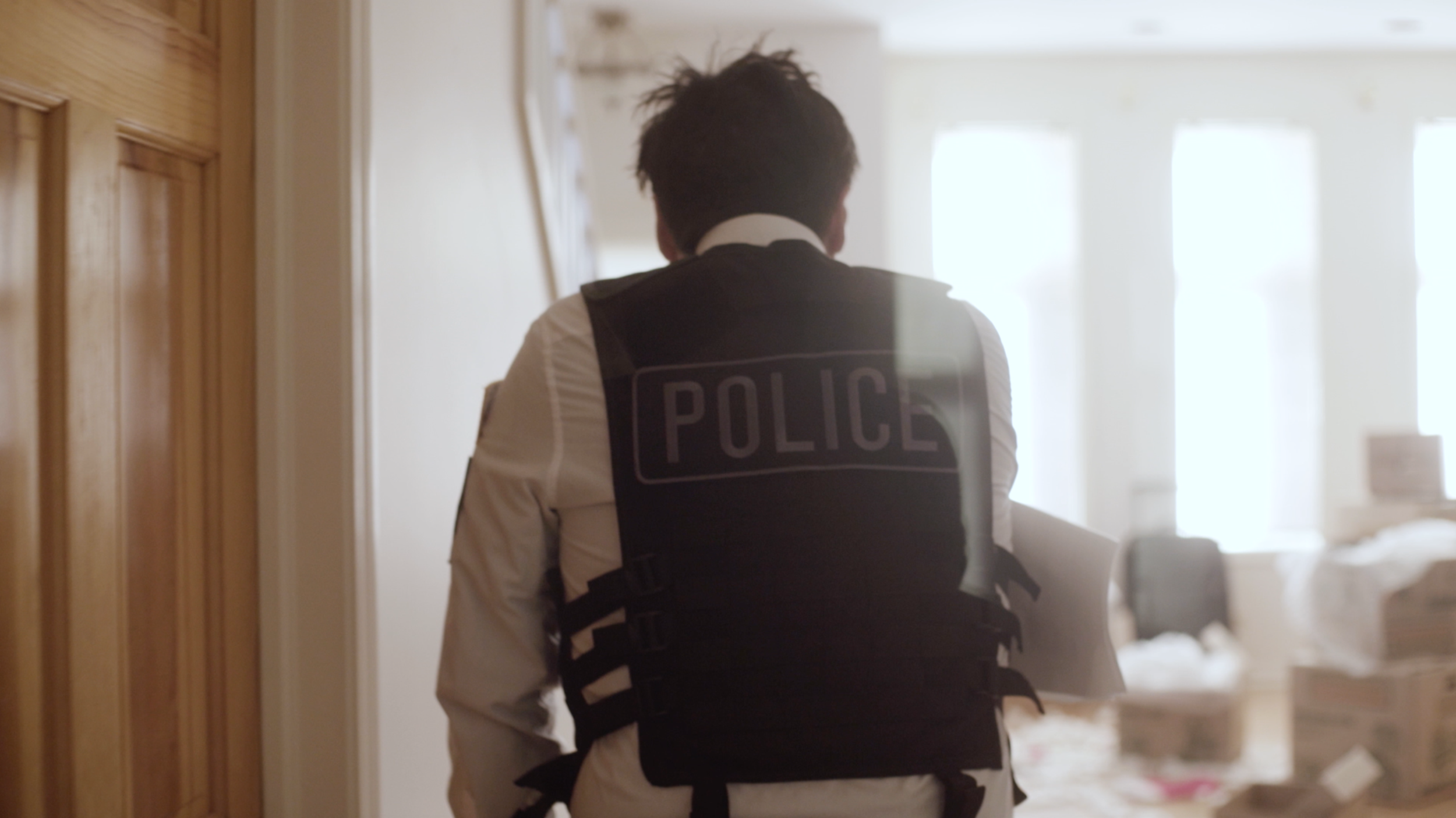 This shot is one of my favorites for several reasons. Looking at lighting first, this whole scene was lit as if it were around midday. The idea and emotion behind this choice was to make the house feel like the light was trying to work its way in to uncover whatever secret lay inside. We used 3 lights total for the shot. First, we had a fatboy (2x4 Kino) rigged up on top of the cabinets in the kitchen for a subtle backlight and fill for the rest of the room. Second, we had two 2x2 Kinos rigged on the stairs to add a slight bar-like effect across our antagonist as he was walked past them like prison bars. The 2x2 kinos were originally supposed to be a lot more prominent but due to weather and the time of year, the sun ended up falling directly on the front windows right before we had to go for our first take. This change in lighting was a big curveball and because we were on a very tight schedule, my only option was to bump up the kitchen exposure and throw a circular polariser on the front of the lens to compensate for the harsh change in exposure in the front room.